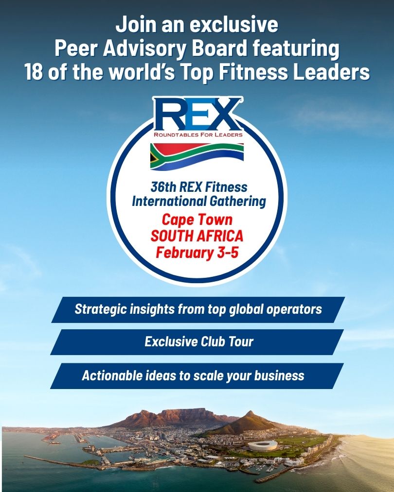 The 36th Gathering of the REX International team will take place in South Africa from February 3 to 5, 2026, bringing together a select group of global fitness leaders for a high-level Peer Advisory experience.